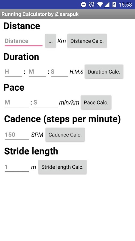 The application helps you to calculate parameter in the running field, such as distance, time, pace, cadence, stride length.