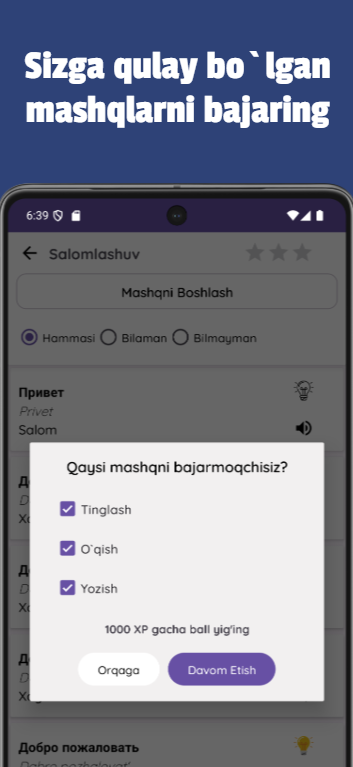 «Рус Тили: Тез ва Осон» иловаси билан бирга со’з бойлигизни оширинг, турли мавзуляр бо’йича машлар баджаринг ва о’йинлар оркали органишни янада кизикарли килин.