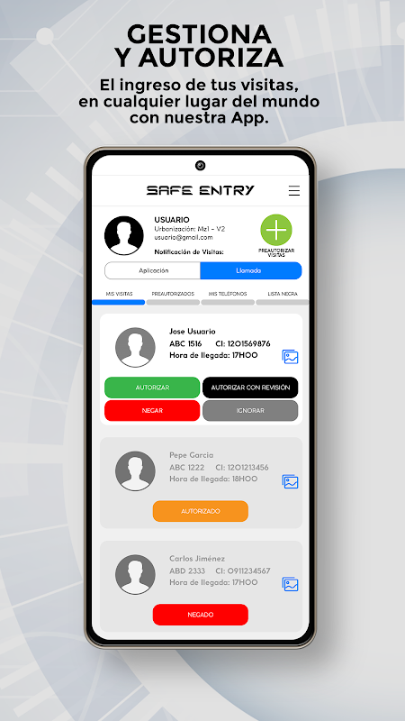 С SAFE ENTRY система контроля доступа к транспортным средствам никогда не была быстрее и безопаснее. Ваши посещения не будут длиться более 40 секунд. зарегистрировавшись в Garita, добиться очень плавного трафика; при этом вы получаете фото лица водителя, фото его удостоверения личности, фото его автомобиля и номерного знака автомобиля. Вы контролируете и авторизуете все это из мобильного приложения SAFE ENTRY.