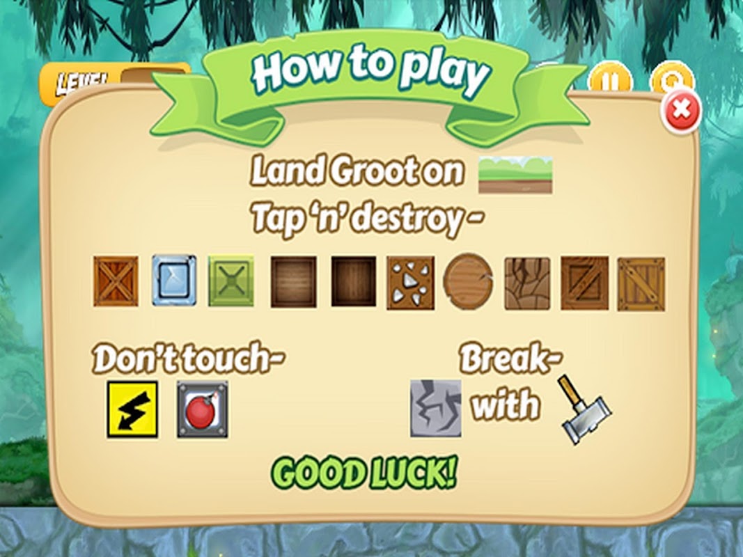 Baby Groot form the Marvel’s Guardians of the Galaxy is trapped in the distant corner of galaxy in a planet called 'Pandora'. Hostile aliens have put it on top of a pile of boxes. Tap and destroy the boxes so that Groot can land on the green block where he'll be safe. Make sure he doesn't touch the ground, bomb or the hammer.