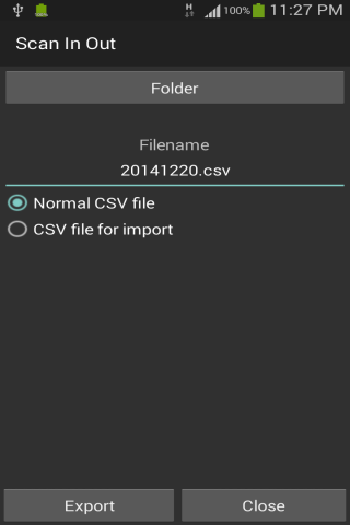 Tap scan to scan barcode. Tap Check In, Check Out accordingly. Tap Menu->Search to see all the data. Tap Export to save the data to sdcard as csv file.