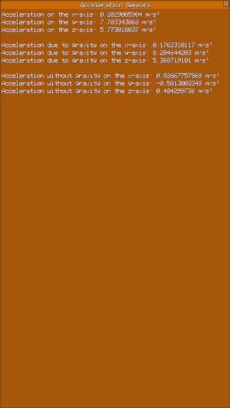 Это приложение для Android, которое просто отображает показания с различных датчиков (если они присутствуют). Он также отображает несколько других значений, полученных из значений датчика (он рассчитывает абсолютную влажность окружающей среды и т. Д.)