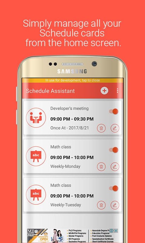 We are constantly working hard on making the “Schedule Assistant” app better and more useful for you. We need your constant support to get going. Please feel free to email us for any queries/suggestions/problems or if you just want to say hello. We would love to hear from you. If you have enjoyed any feature of the “Schedule Assistant” app, do not forget to rate us on play store.