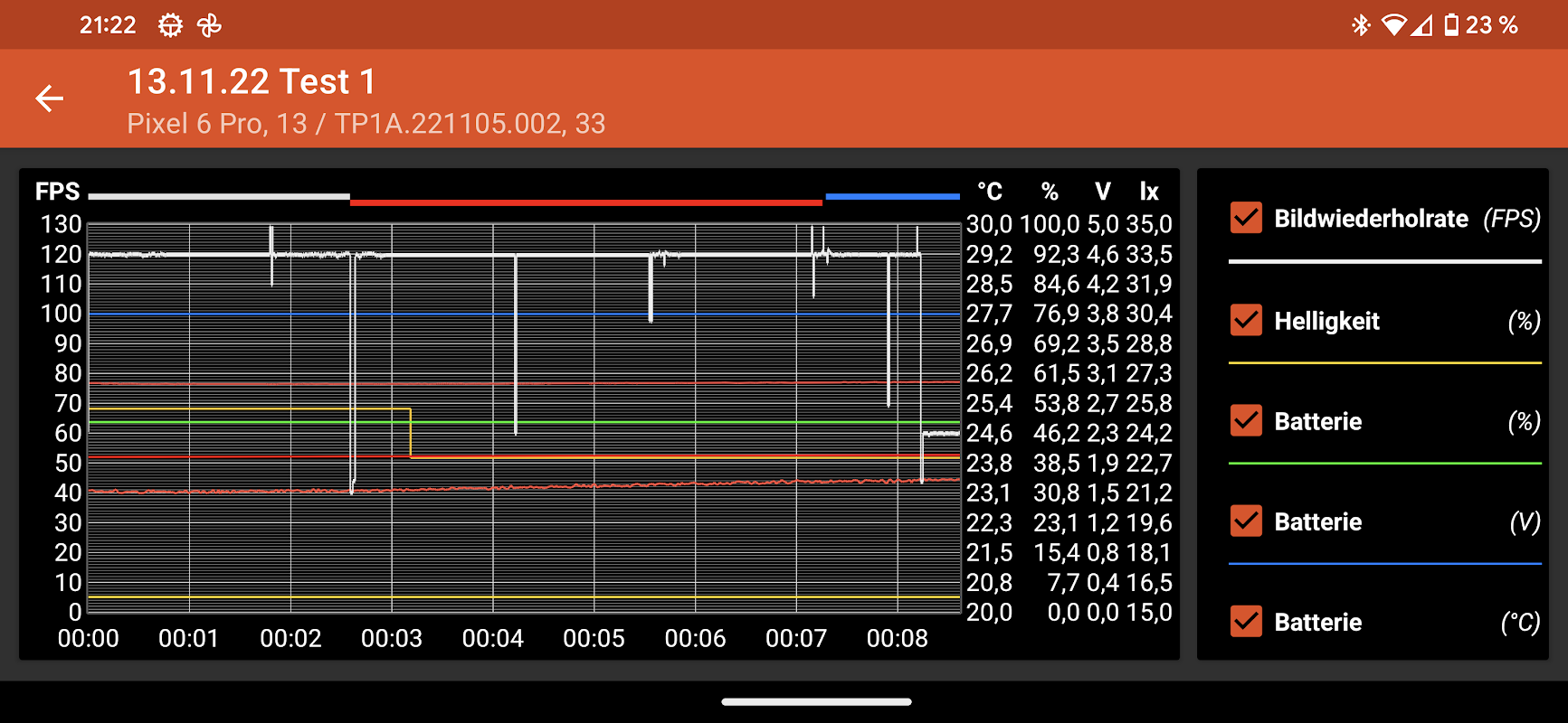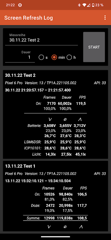Записывает частоту кадров устройства, заряд батареи, значения яркости и температуры.