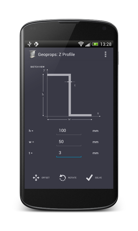 Geoprops является калькулятор геометрических свойств для различных типов секций. В основном рассматриваются гражданских инженеров / Структурные, но может быть использован любой студент, который должен вычислить площадь и геометрический центр фигуры. Это позволяет пользователю рассчитать различные геометрические и механические свойства, такие как область, центроида, момент инерции, и многие другие для исчерпывающего библиотеки предопределенных секций, а также пользовательские формы, определенные через их узлы. Специальные функции позволяют пользователю изменять происхождение и ориентацию оси координат, что делает его легко вычислить свойства раздела по отношению к любой системе отсчета. Кроме того, пользователь может задать количество десятичных знаков для результатов, а также единицы, которые будут использоваться. Различные устройства могут быть использованы для входов и для результатов. Сводный расчет может по отправлены по почте или Google Drive.