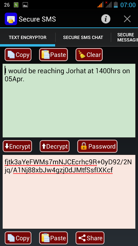 This app can be used for encrypting your message text , SMS or email content using Advanced Encryption Standard (AES). It can encrypt/ decrypt messages using AES. COMPLETELY FREE OF ADVERTISEMENTS. The crack resistitvity of an AES depends on the password length and complexity. The app ensures that the user selects a password with min 6 characters having atleast one uppercase letter, one lower case, one special character and one digit.