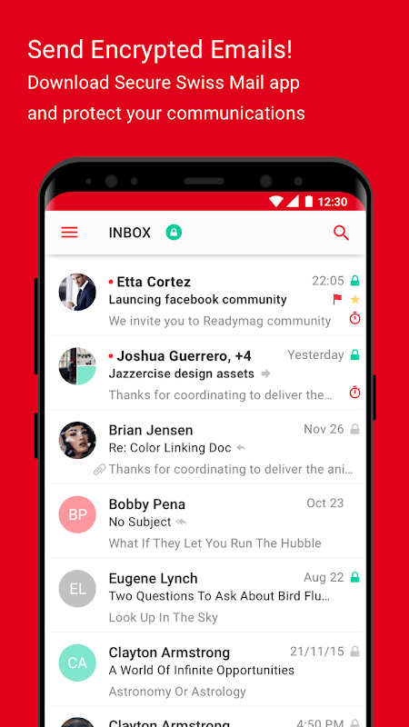 Secure Swiss Data Email App for Android lets you send and receive end-to-end encrypted emails to Secure Swiss Data users. You can also send and receive emails from any other email clients.