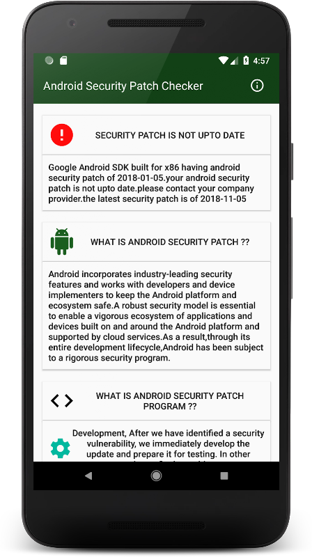 Это приложение сообщит вам, что ваш патч безопасности обновлен, или нет, это поможет вам получить последнюю версию исправления безопасности для Android. Мы проверяем патч прямо из последнего обновления обновления для системы безопасности каждые месяцы. Google выпускает патч безопасности каждый месяц, и мы получаем информацию о прямых патчах из их каталога, и на этой основе проверитель сообщит вам об этом!