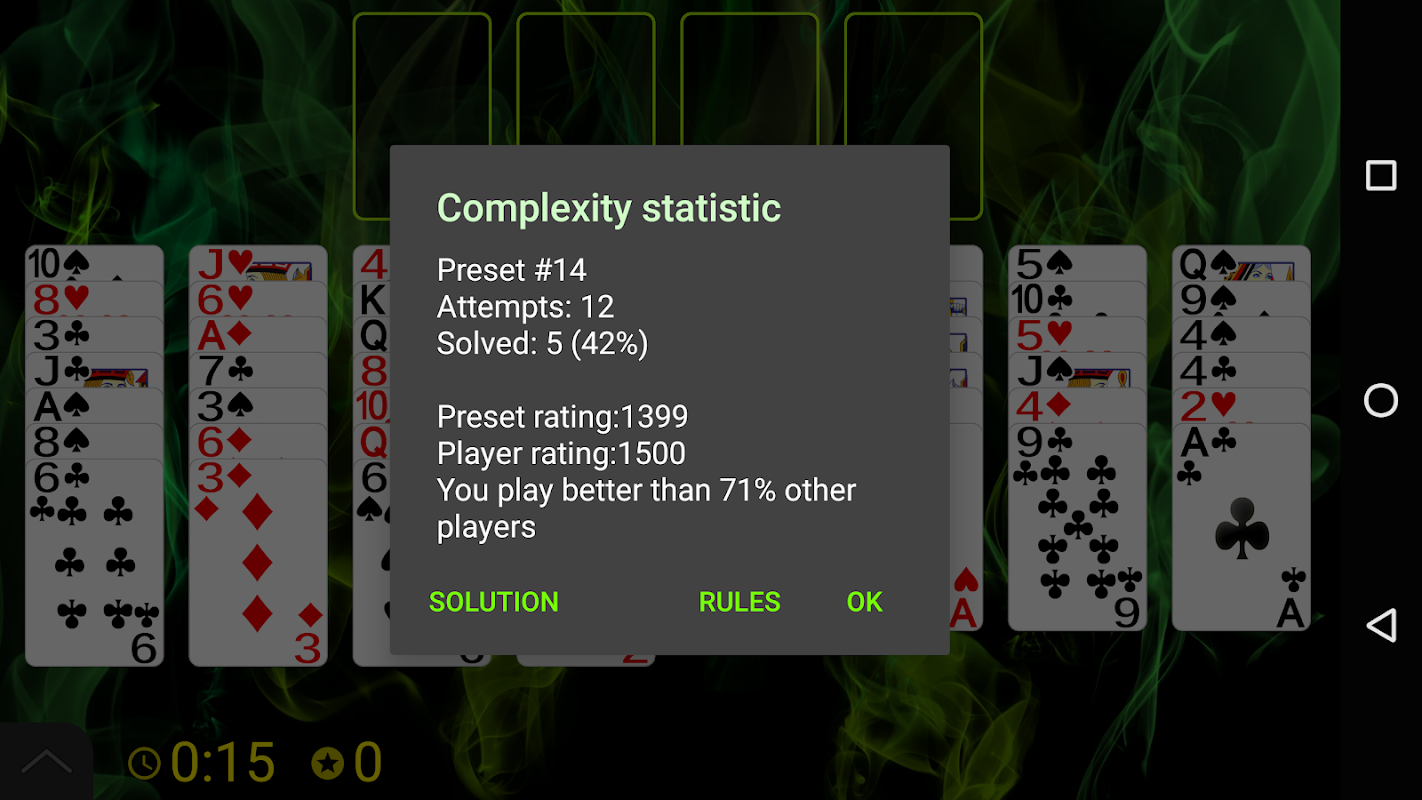 Используйте все карты, чтобы завершить Основы. Выстраивайте их по масти, начиная с ранга первой карты, перемещенной в первую стопку, переворачивая K -> A, пока в каждой стопке не будет 13 карт. Карты Tableau должны быть выстроены в нисходящей последовательности независимо от масти. Положите любую карту в пустой столбец, верхняя карта стопки доступна для игры