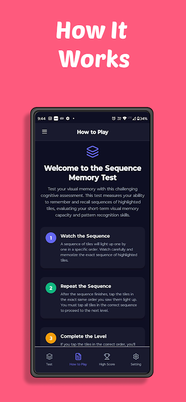 Тест на память последовательностей — это развивающая игра, которая тренирует вашу кратковременную память, зрительное восприятие и концентрацию внимания. Вам предлагается последовательность из мигающих плиток, которые нужно повторить в правильном порядке. С каждым успешным прохождением последовательность становится длиннее, заставляя ваш мозг запоминать больше, быстрее реагировать и глубже сосредотачиваться. Тренируете ли вы когнитивные способности, оттачиваете свои умственные способности или просто развлекаетесь — этот научно обоснованный инструмент делает тренировку памяти доступной вам.