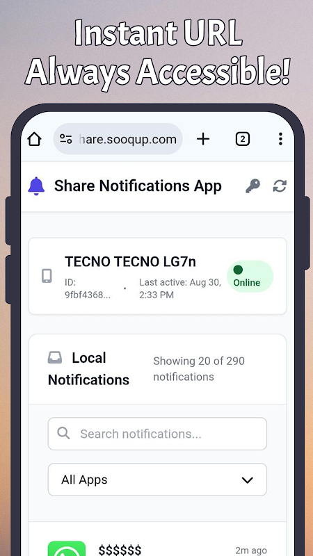 Благодаря локальному доступу к уведомлениям вы можете видеть все уведомления, полученные на устройстве, на котором установлено приложение, без необходимости синхронизации. Для еще большей гибкости вы можете открыть защищенную ссылку в браузере, чтобы просматривать эти уведомления где угодно и когда угодно.
