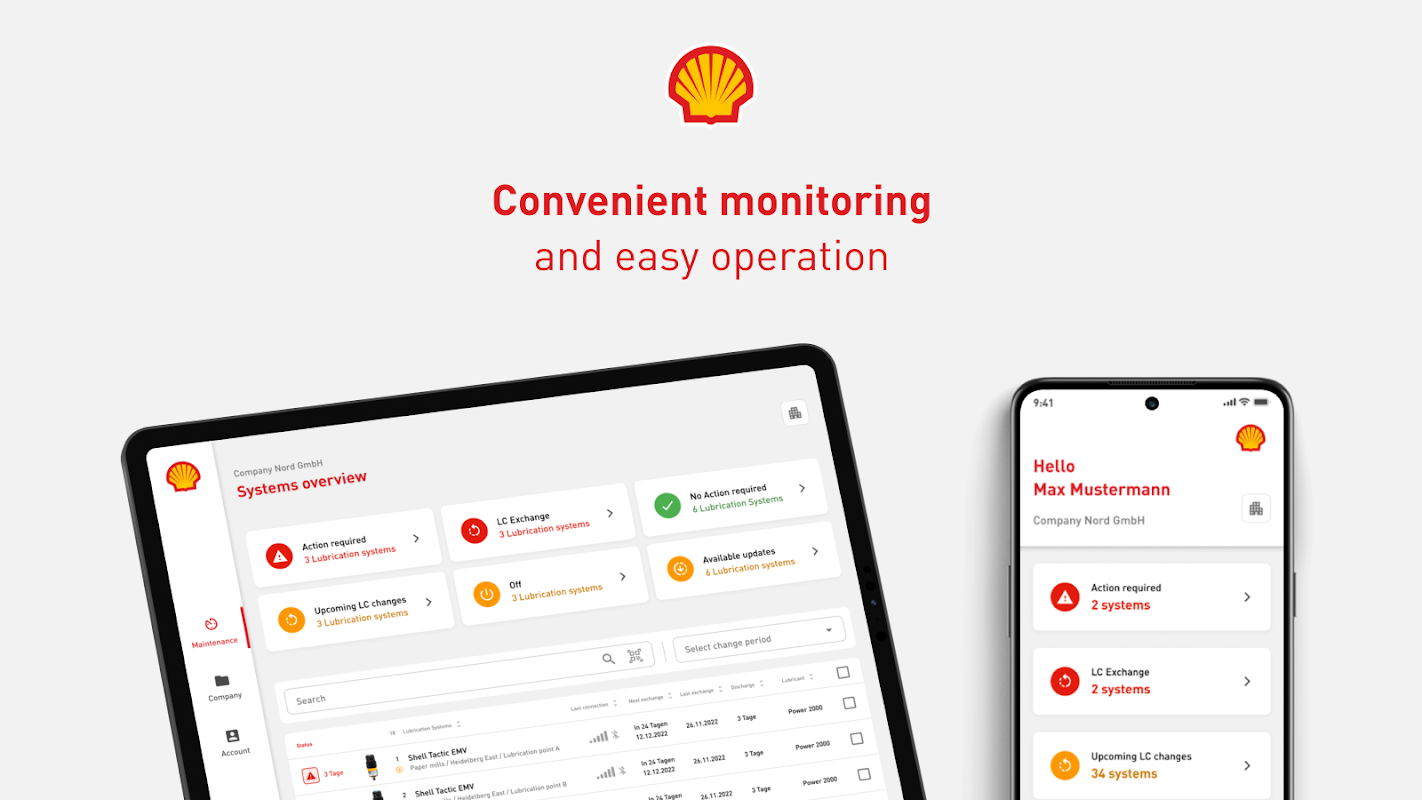 Работы по техническому обслуживанию становятся безопаснее, поскольку системы смазки корпуса в труднодоступных или опасных зонах можно легко и надежно контролировать на расстоянии. Изменение периода разряда или запуск дополнительных сливов (PURGE) возможно в любой момент во время работы. Приложение сообщает об ошибках, например о избыточном давлении, пустой жидкостной хроматографии или отклонении температурного диапазона. В зависимости от требований к оборудованию вы можете использовать приложение Shell Tactic Connect для включения и выключения систем смазки Shell на своем мобильном устройстве, локализации систем смазки с помощью сигнала или даже отображения истории работы лубрикатора.