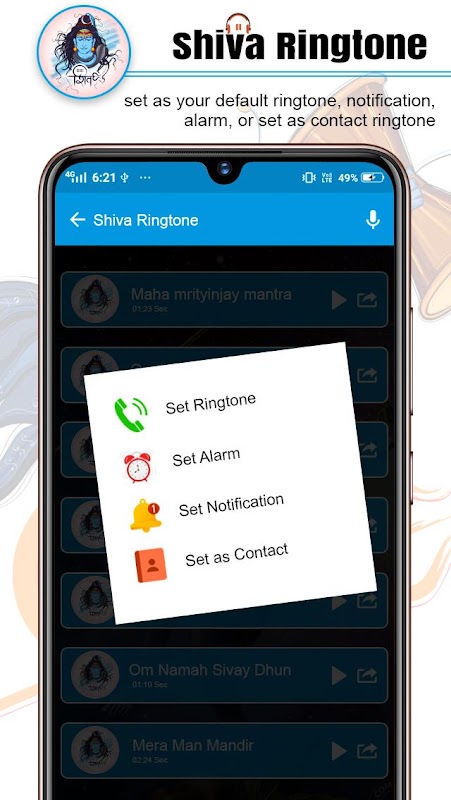 Using this Lord Shiv(Mahadev) Rigntones app you can set ringtones and wallpaper of Lord Shiv as your mobile ringtone..