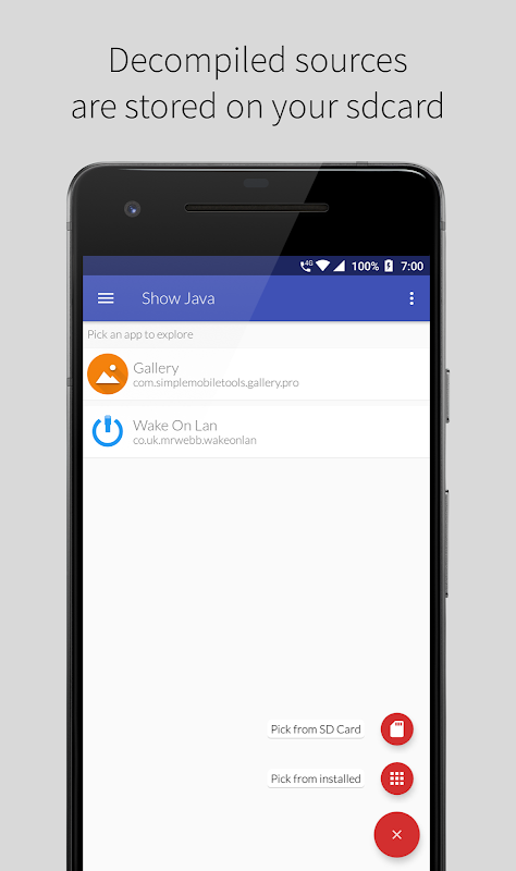 • Select apk/jar/dex from sdcard (or) from a list of installed applications.