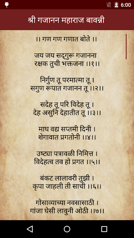 खास गजानन महाराज भक्तांसाठी श्री गजानन विजय ग्रंथ आता तुमचा फोन मध्ये. श्री गजानन विजय ग्रंथ खूप लोकप्रिय आहे. त्याचे भक्तिभावाने पारायण केल्यास इच्छीत मनोरथ पूर्ण होतात असा भक्तांचा विश्वास आहे.