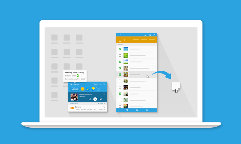 SideSync is a new PC-Mobile solution that enables screens, windows, and data to be shared easily. Share between a PC and a Galaxy smartphone, or between a Galaxy Tab and Galaxy smartphone.