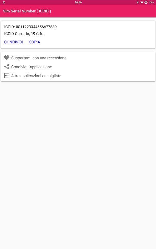Серийный номер сима, простое приложение для чтения кода ICCID, который обычно пишется на обратной стороне сима, часто случается, что он обрезан (например, для перехода на микросим) или по той или иной причине больше не читается, а вот и серийный номер сима, приложение, которое позволяет вам считывать код с вашего сима, даже не снимая его с телефона, одним щелчком мыши, а если вам нужно сообщить его кому-то, удобные «поделиться» и « копия" подходят именно вам!