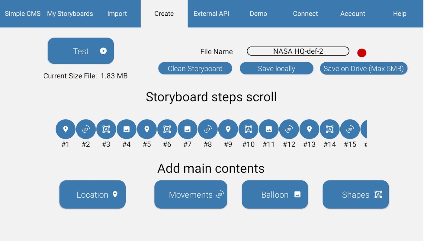 After creating a storyboard is feasible to save it locally or in google drive. Also, it is possible to import a storyboard from google drive. It is important to mention that saving and importing storyboards are only available if you are logged in the application. On the other hand, Simple CMS downloads community names, city, country and location of the different Google Developers community at Meetup.com. Finally, It is possible to do a tour of all the google developers community around the world.