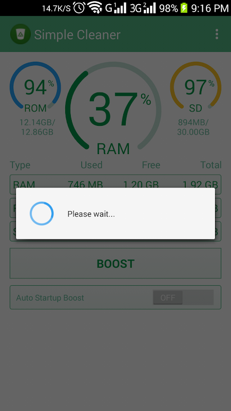 Есть другие аспекты управления памятью приложений там, но они очень сложны в пользовательском интерфейсе, что сам по себе требует высокого ресурса, как RAM. Вы просто хотите один кран решения, чтобы ускорить ваш телефон. Простой уборщик именно это. Просто откройте приложение и нажмите на Boost. У вас есть возможность, чтобы повысить при запуске, так что вам не нужно нажать на кнопку Boost, больше.