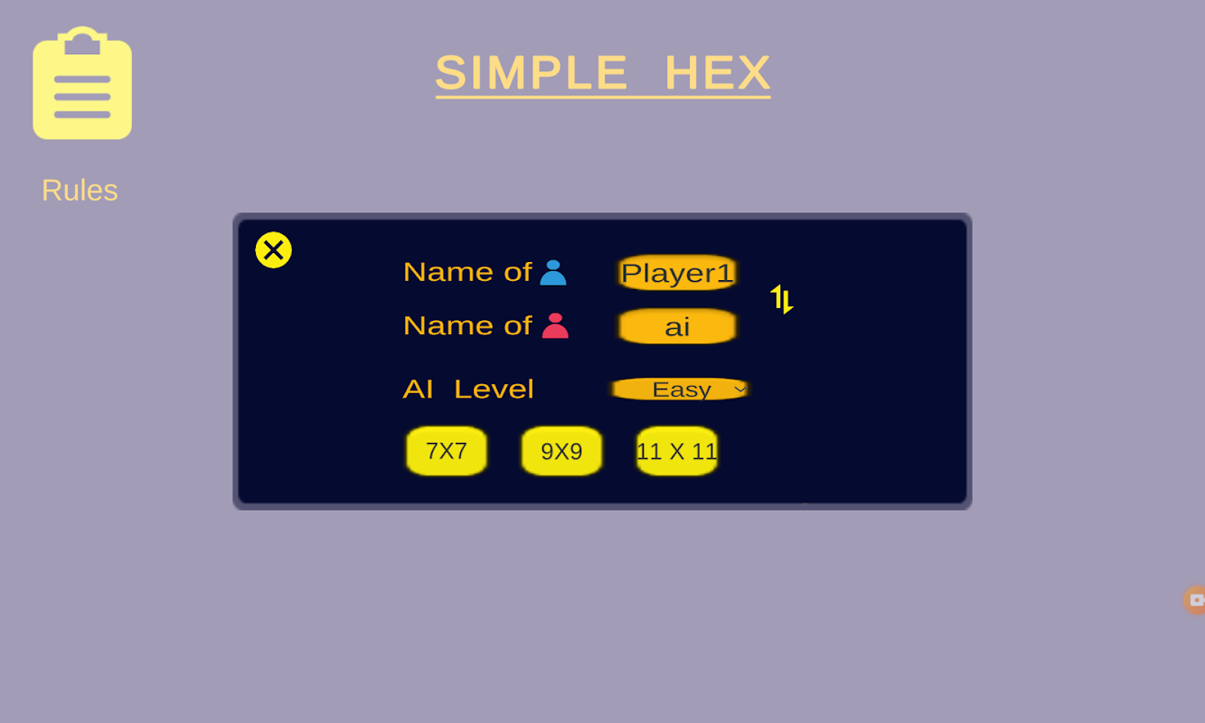 Мы ввели 3 размера доски 7X7, 9X9 и 11X11, чтобы пользователи постепенно созревали для игры в более длинные версии игры. Отсюда и название Simple Hex