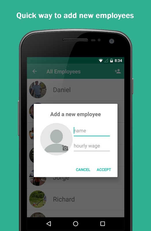 Adding a new employee just requires a name and wage. Optionally, you can add a picture too.