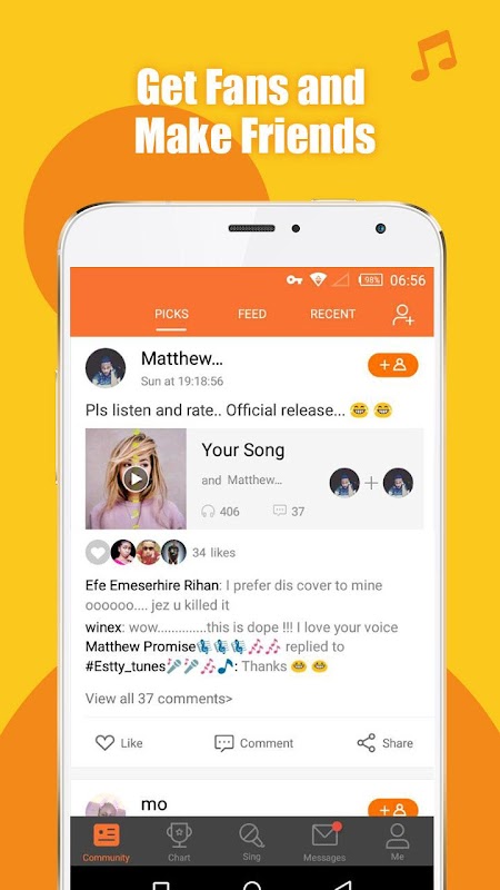 1. Platform for all music lovers. Free to sing your favorite song, make friends and get a chance to be a superstar;