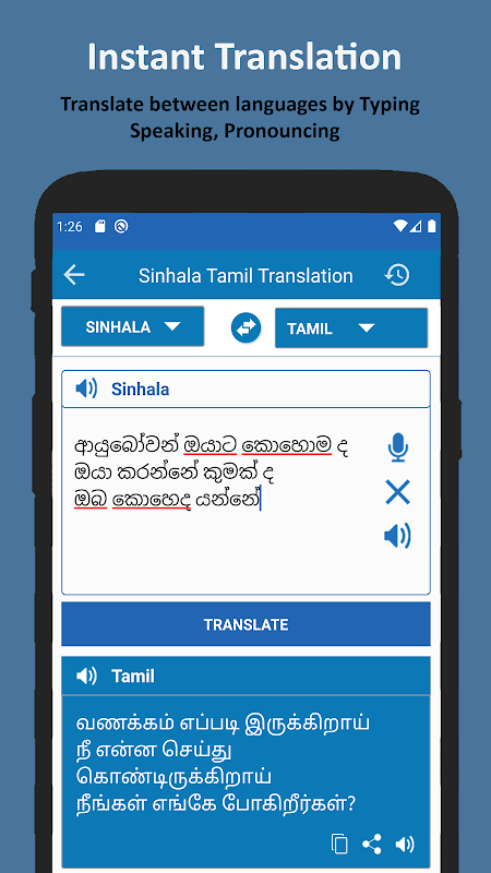 Приложение «Переводчик с сингальского на тамильский» полностью бесплатно для всех пользователей. Вы можете переводить целые абзацы с сингальского на тамильский и с тамильского на сингальский. Приложение «Переводчик с тамильского на сингальский» — лучшее решение для быстрого перевода текстов на вашем мобильном телефоне или планшете.