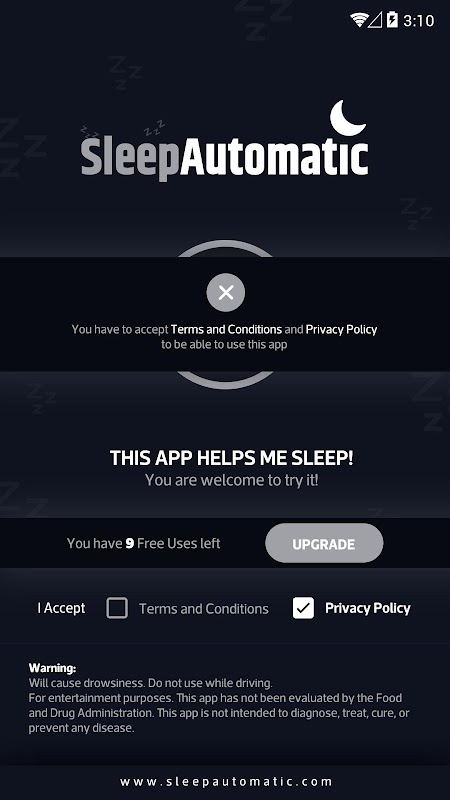 Sleep Automatic has specially designed sound frequencies that makes me fall asleep pretty fast. This does not mean it will work for you. I made it for my personal use, and when I saw that it works for me, I thought I would share it. Please note that I make no claims that it works in any manner. But I will say this: do not use when driving or doing anything that requires alertness. Do not use when handling heavy machinery or when in a bathtub. I accept zero responsibility for your falling asleep. And here is the legalese: This app does not claim to diagnose or treat any condition. This app is for entertainment purposes. It may make you drowsy and may make you fall asleep, so use with due care and diligence.