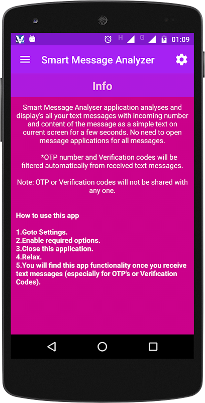 Smart Message Analyzer displays your message incoming number and content of the message as a simple notification on your screen for a few seconds without opening this application. Smart Message Analyzer majorly helps you while playing games, watching videos and also no need to interrupt your work for unnecessary messages.