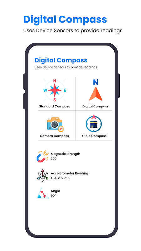 Уверенно перемещайтесь, используя компас Киблы для направления молитвы, компас северного направления для точного ориентирования и компас камеры для навигации по экрану. Измерьте напряженность магнитного поля, проверьте показания акселерометра и точно найдите точный угол устройства.