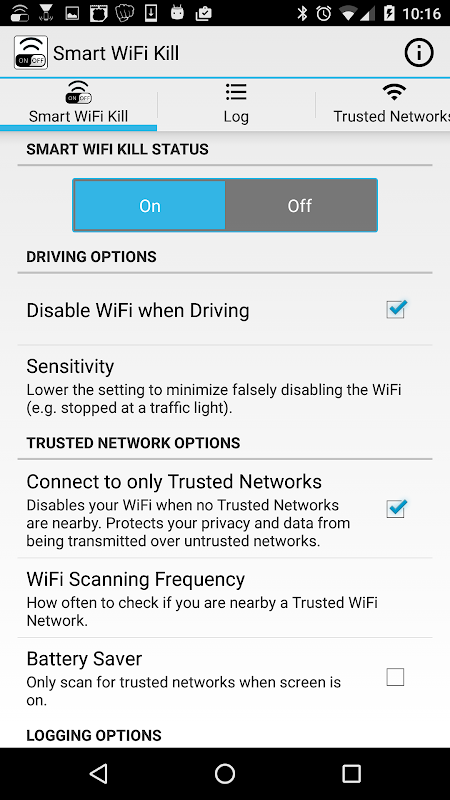Защитите вашу частную жизнь и данные, и только подключиться к доверенной сети! Просто добавьте ваши доверенные сети в список надежных сетевых в приложение и только тогда, когда один или несколько из этих сетей находятся рядом будет ваш Wi-Fi на самом деле позволит. Используйте символ 'любой', чтобы подключиться к любой сети только имя. Или быть чрезвычайно ограничительный характер и только позволит вашей WiFi, когда сеть с таким же именем и MAC-адрес находится рядом.