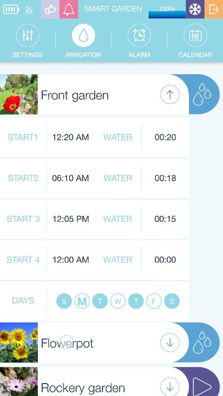 Умный сад предлагает профессиональное решение для управления садоводства орошения, инновационный стиль, аппаратных и программных средств при разработке новой технологии, гибкость, расширений, профессиональных функций, удобный для пользователя устройства, надежности и технической поддержки на высоком уровне. Включает в себя: Настройки сети для полного орошения зоны пригодности. Режим Две программы, каждого клапана или по программам (А, В и С). Четыре времени начала с дозировкой уникальная вода, ежедневно, еженедельно и ежемесячно цикла, список аварий, календарь оросительной презентации. Ручка до шести оросительных клапанов. Кроме того, один выход для главного клапана. Три специальные входы: реле расхода, датчик дождя и кнопка паники. Низкое потребление энергии.