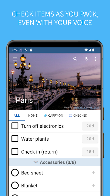✈ Приложение автоматически подскажет, что взять с собой, исходя из продолжительности поездки, пола и контекста/деятельности (например, холодная или тёплая погода, самолёт, автомобиль, командировка, домашнее животное и т. д.)