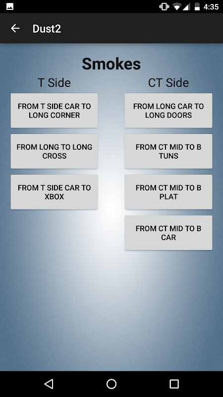 This is a guide for smoke spots on 8 maps in CS:GO. The 8 maps are Nuke, Overpass, Inferno, Cache, Cobblestone, Dust2, Train, and Mirage. There is an option to turn on or off color coded smoke difficulty. The images for the smokes is part of the application download. If you would like me to include a smoke just leave a review with where from and where it lands and I will try to make it happen.