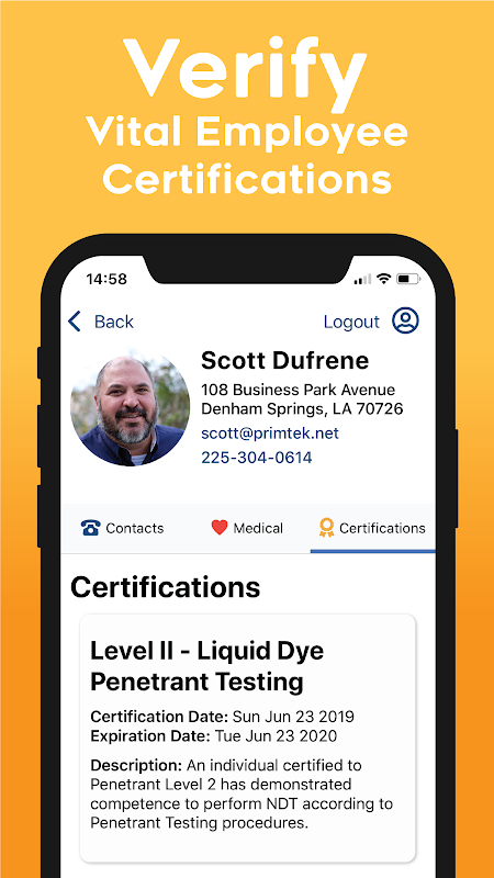 Using the mobile app, users can scan employee QR codes to view employee basic information, emergency contacts, medical conditions and certifications.