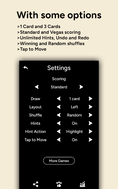 Играйте в Draw 1 или Draw 3, проверьте свои навыки в режиме Vegas Mode и испытайте себя в случайных или выигрышных перетасовках. Настройте игру с помощью различных тем, включая эксклюзивный темный режим AMOLED для первоклассного ощущения.