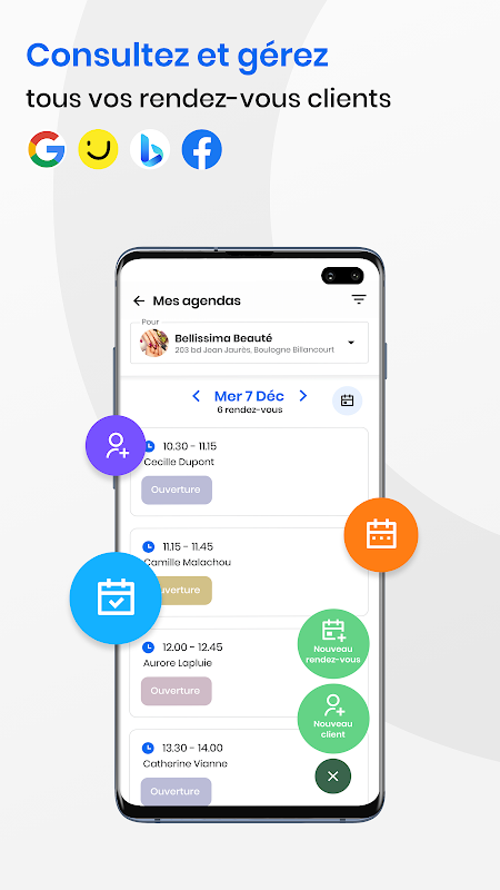 - Консультируйте и управляйте всеми вашими встречами с клиентами, сделанными на основных платформах (Google, PagesJaunes, Facebook) из вашей онлайн-повестки дня *,