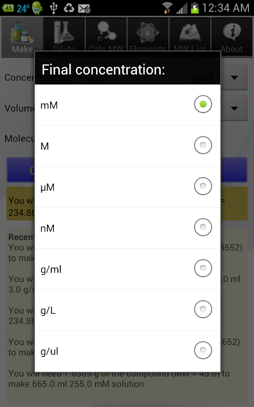 (1) Она имеет удобный калькулятор для приготовления химических растворов, а также для разбавления решения с использованием стандартного раствора. Это поможет вам быстро определить, сколько химических / раствор вам нужно. Вам не нужно возиться с калькулятором и может потратить больше времени в вашей исследования или исследования.