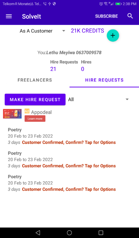 Connects Freelancers and Customers where most of work is taken care of, customers view the freelancer's schedule and confirm or change the date of hire requests and add their skill interests and freelancers find them and market themselves knowing their budget and send a push notification.