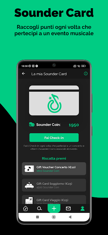 > С помощью функции CHECK-IN вы можете накапливать баллы (монеты Sounder) каждый раз, когда участвуете в музыкальном мероприятии, и конвертировать их в призы.
