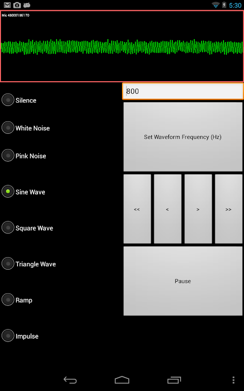Soundform генерирует белый и розовый шум, синус, меандр, треугольник, пилообразный волн и импульсов. Использование нескольких циклически буферы, обновляется случайно, поэтому обеспечение действительно случайные белый / розовый шум.