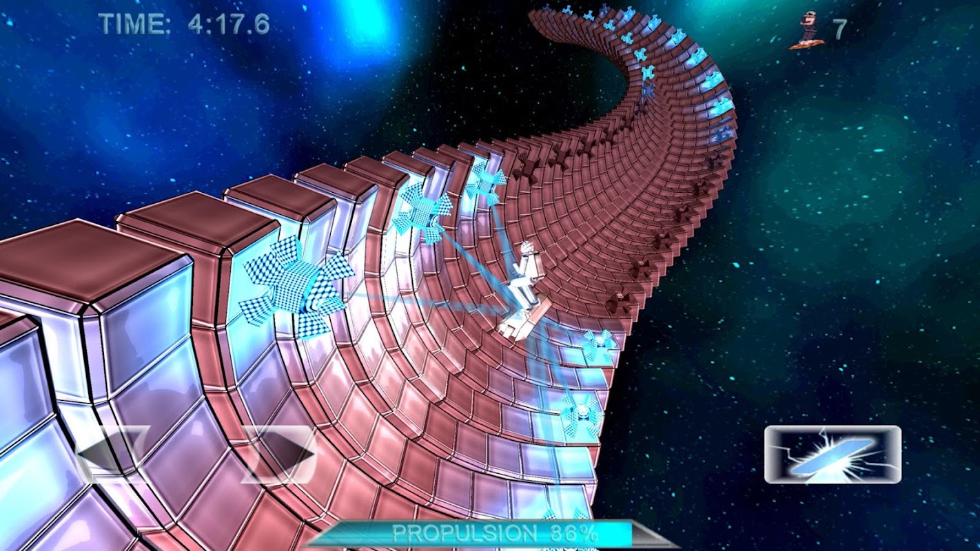 You will have to pass near the blue terminals to recharge the propulsion while avoiding the red terminals that have a reverse effect and drain your board in a few seconds.