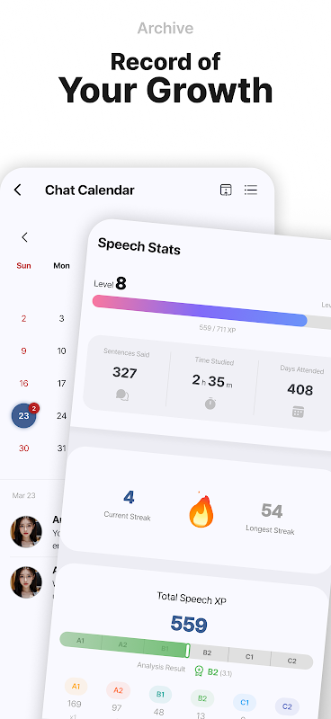 Чем больше вы общаетесь с вашими AI партнерами, тем больше очков опыта вы накапливаете. Повышайте уровень, чтобы разблокировать новые увлекательные функции в приложении, превращая ваше изучение языка в игру.