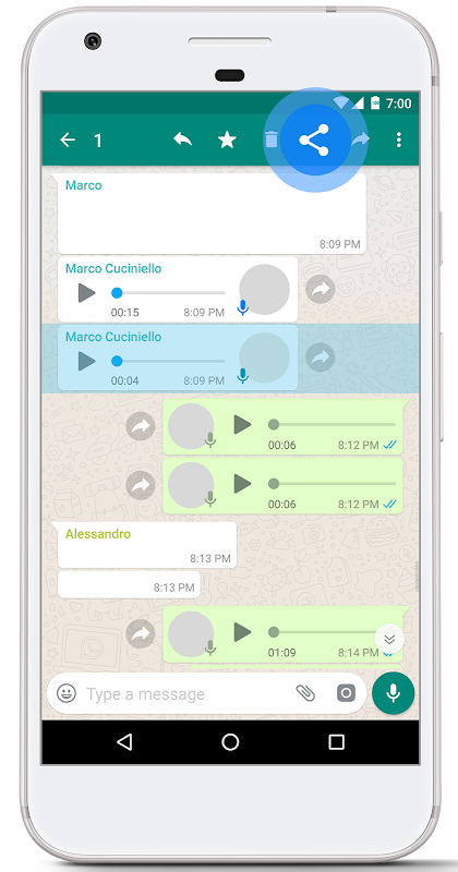 Вы можете просто переслать WhatsApp голосовой заметки приложение и через несколько секунд вы получите текст, готовый к копированию или совместно легко.