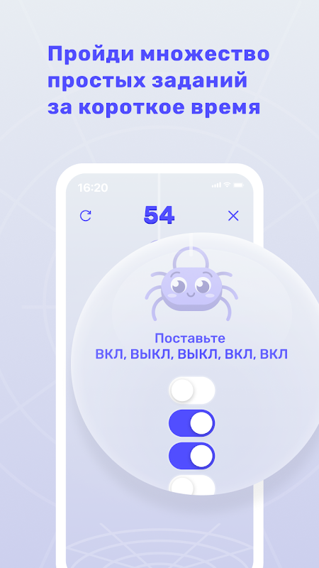 Паучок испытает твою скорость, умение мыслить логически, прокачает твои рефлексы и натренирует память. С каждым уровнем ты станешь мыслить чуточку эффективнее, прокачаешь креативность и расшевелишь мозг. И все это во время отдыха с игрой Spider!