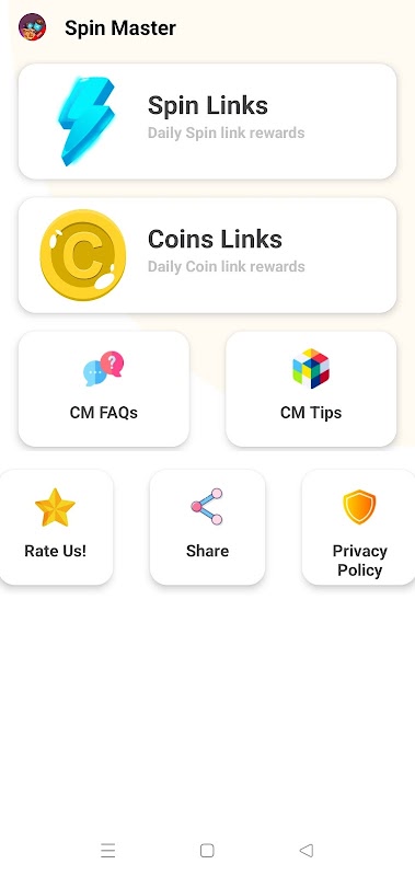 We use all spin, coin and other reward links from available public domain such as Official Facebook, Twitter pages of CM Game Spin master, We don't claim rights on any content in our Spin Link app. We always respect the rights and content of owner. Please note that this application is NOT a means of circumventing game mechanics and abides fully by respective laws, terms and conditions of Google play.