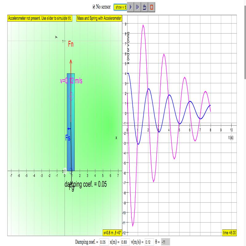 The Horizontal Mass and Spring Harmonic Oscillator mobile JavaScript model illustrates the forces and dynamics of a simple oscillator. This simulation uses the accelerometer on your mobile device to read the direction of the gravitation field g. You may need to lock the orientation of your screen to maintain a fixed view as you tilt your device. For use on computers without an accelerometer or for classroom use, the "No sensor" mode simulates a tilted device in the view. See also the Vertical Mass and Spring mobile JavaScript model.