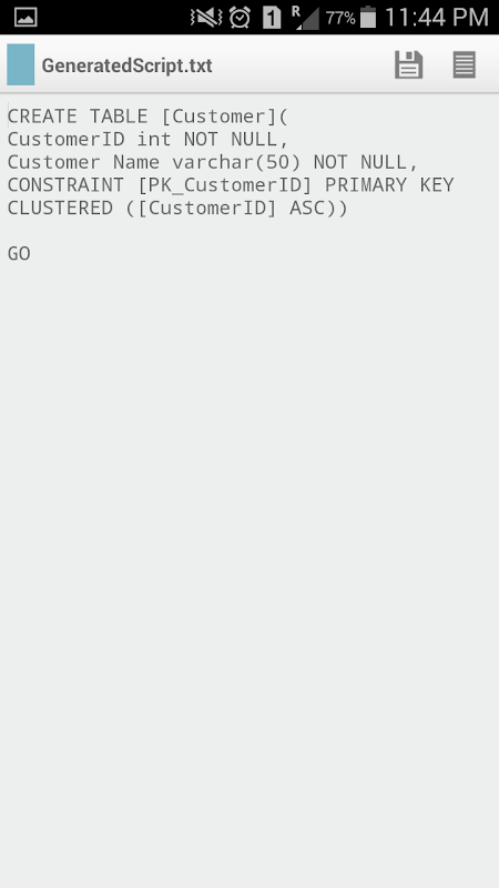 Create Table Script will be generated here for list of tables you choose through provided checkboxes. All generated script will be saved at ExternalStorage: /mnt/sdcard/SQL/GeneratedScript.txt.