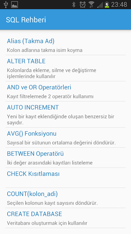 SQL hakkında bilmeniz gereken tüm temel konulara bu uygulama ile ulaşmanız mümkün. KOnular olabildiğince basitleştirilerek anlatılmış ve örneklendirilmiştir.