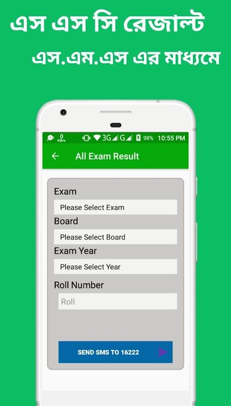 ২. এমএমএস এর মাধ্যমেঃ- সেজন্য অ্যাপসের SMS অপশানে যেয়ে রোল নাম্বার, সাল ইত্যাদি পূরণ করে সেন্ড করলে ফিরতি SMS এ রেজাল্ট পাওয়া যাবে।